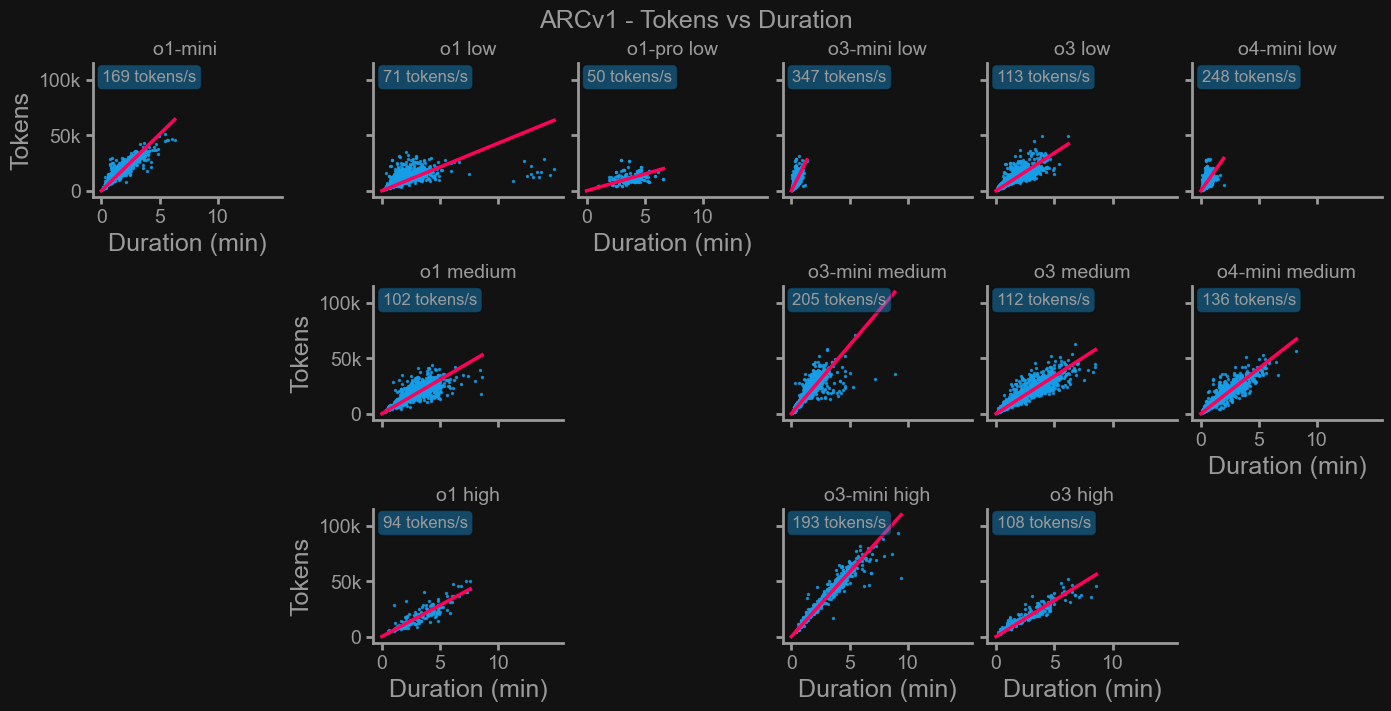 In total, we ran 2 models (o3 and o4-mini) at 3 reasoning levels (low/med/high) each, tested across 740 tasks from ARC-AGI-1 and ARC-AGI-2 for a total of 4.4K data points. Here’s what we found: