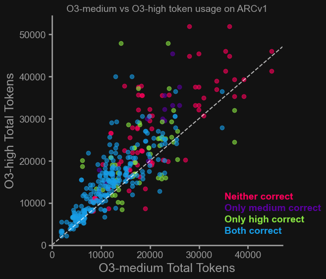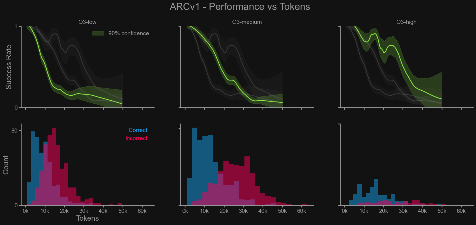 To try and understand why o3-high failed to respond to certain tasks, we analyzed its token usage, runtime, and performance across other models and ARC-AGI evaluations.