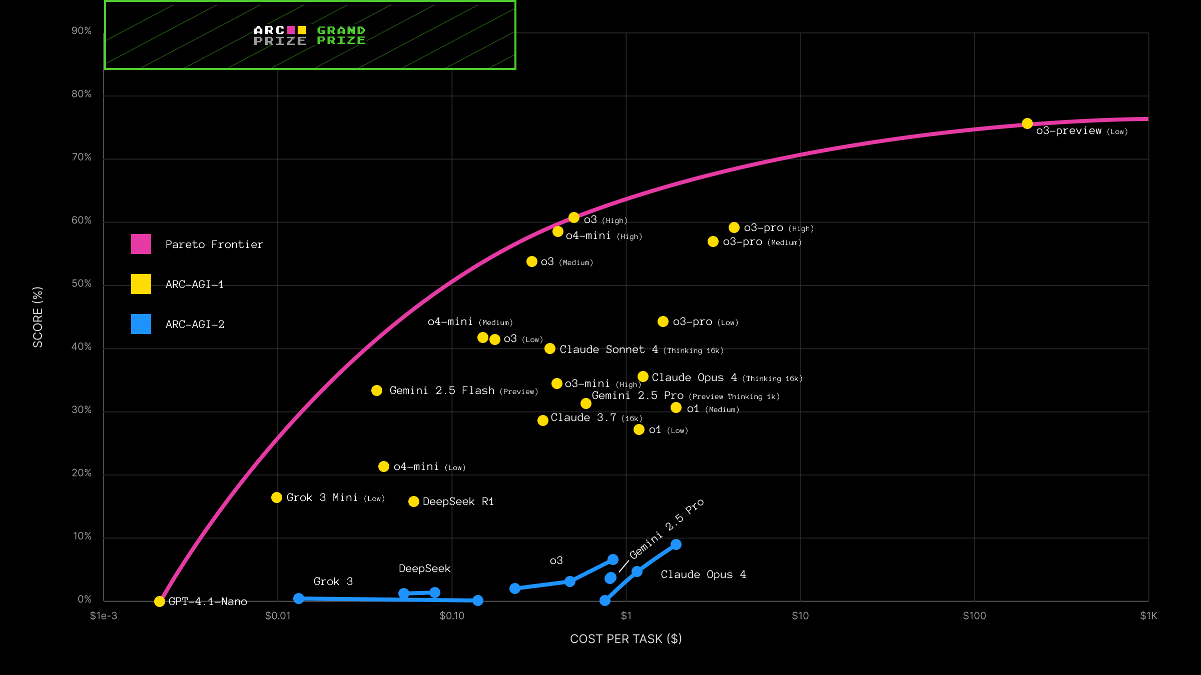 ARC-AGI-2, launched March 2025, and is designed to challenge AI reasoning systems. The fact that we're seeing such uniformly poor results on v2 strongly suggests all the frontier AI reasoning systems share common limitations.